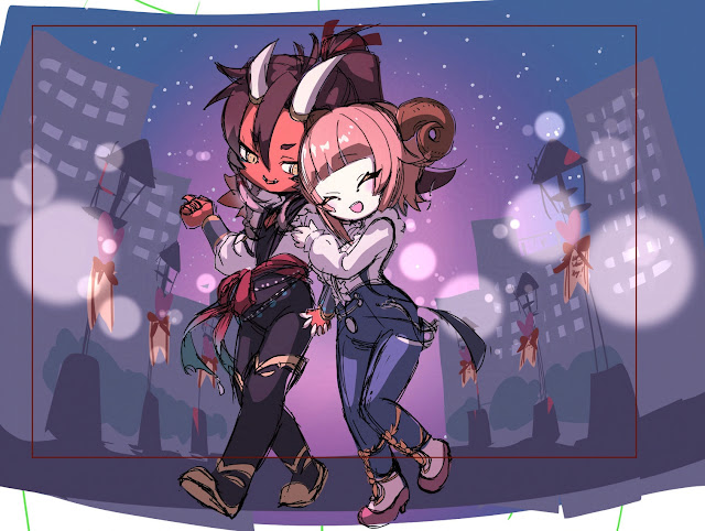 ディナーに向かう前の楽しく街歩きしている様子を描いていきます。
